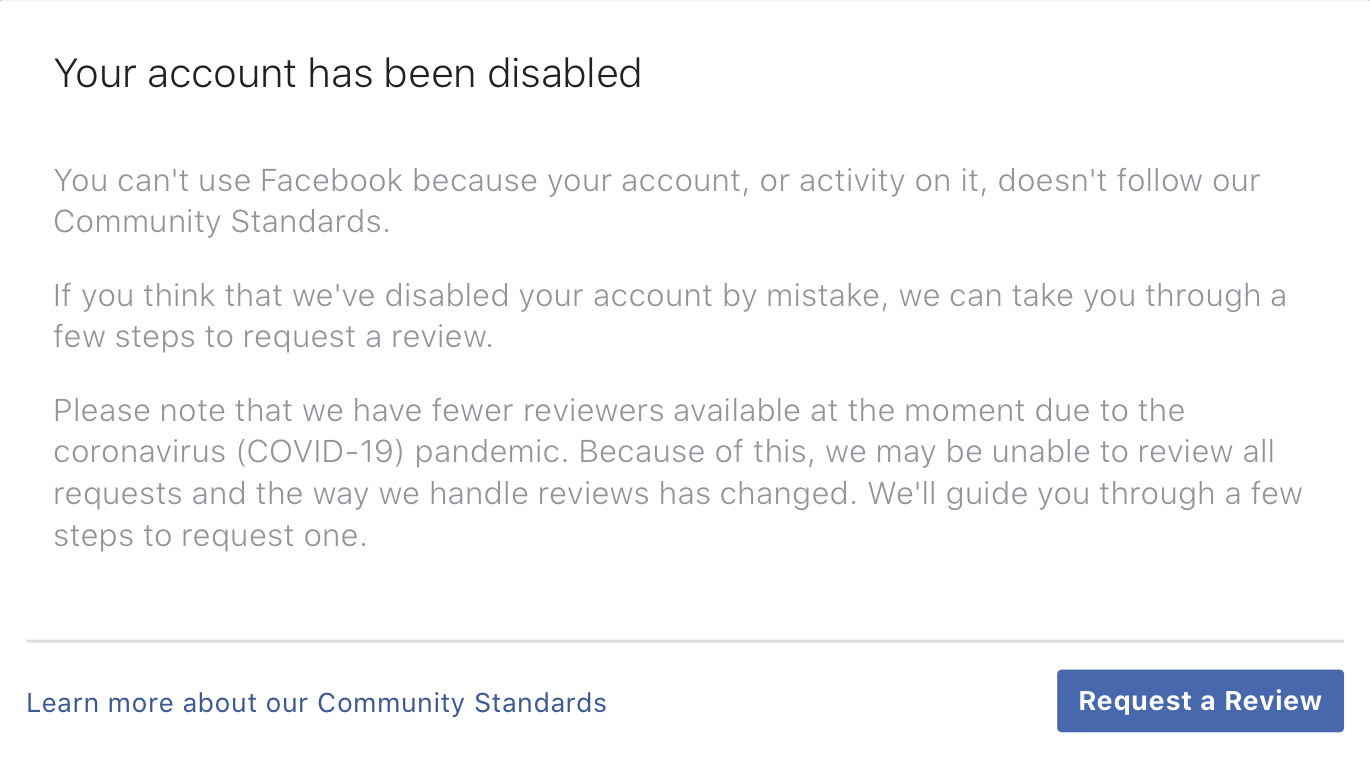 The best part is saved for last. The coronavirus is somehow responsible for Facebook possibly being unable to unblock my account: