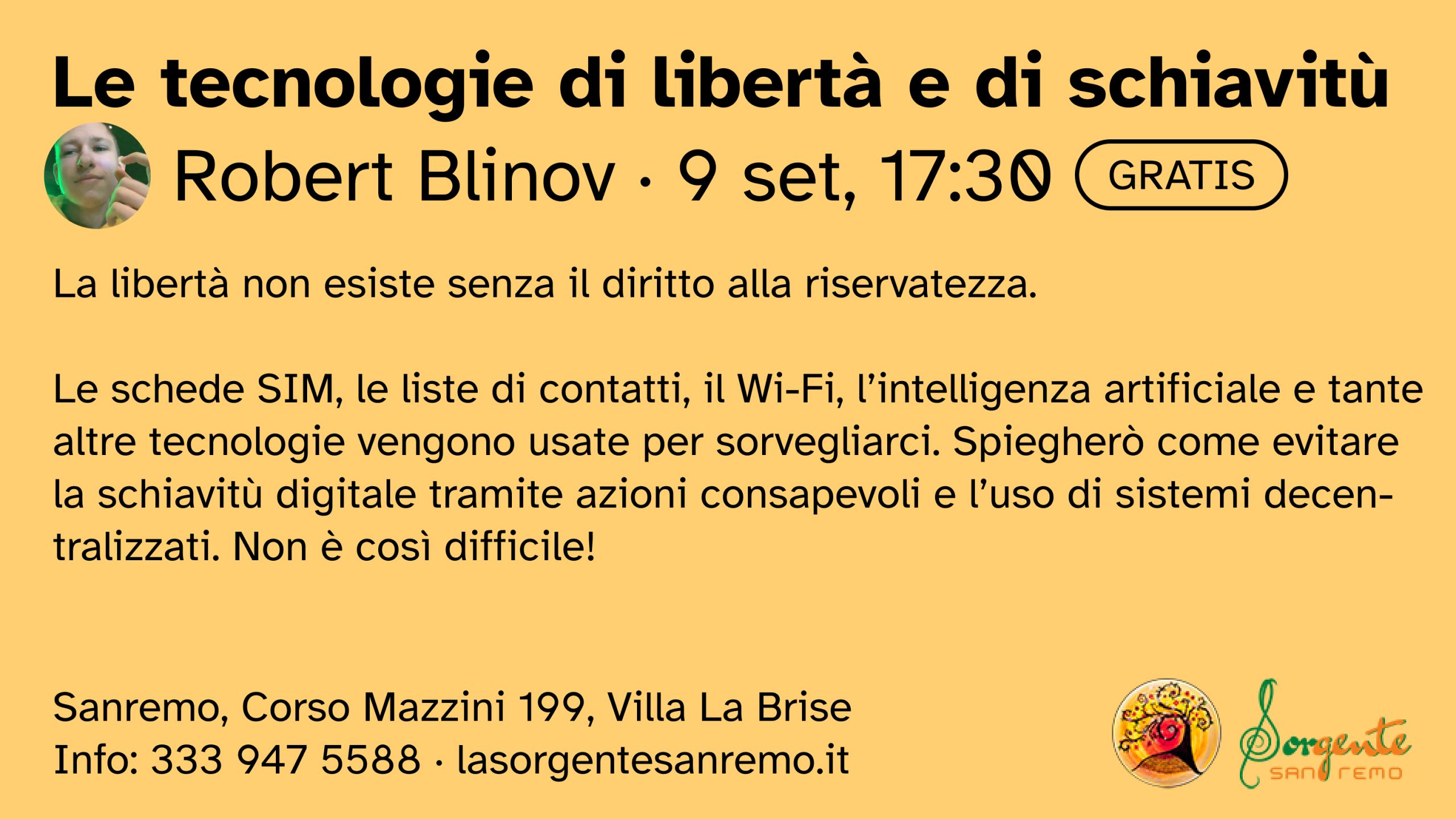 Tech of freedom and of slavery I will be giving a talk about the state of modern technology at Villa La Brise in Sanremo. Saturday 9 September, 17:30.